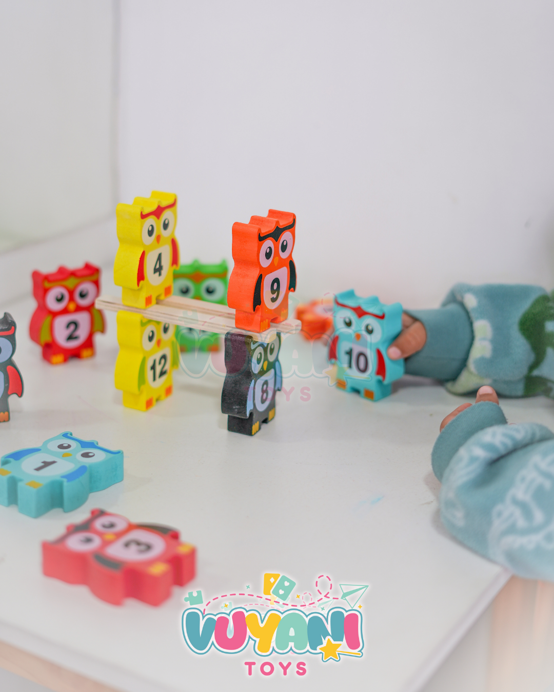 - 12 figuras de búhos de madera resistente, pintados con colores vivos y con bordes redondeados para brindar una mayor seguridad. En el centro y por ambos lados, cada figura contiene un número con su representación numérica y su equivalente en texto (en inglés).