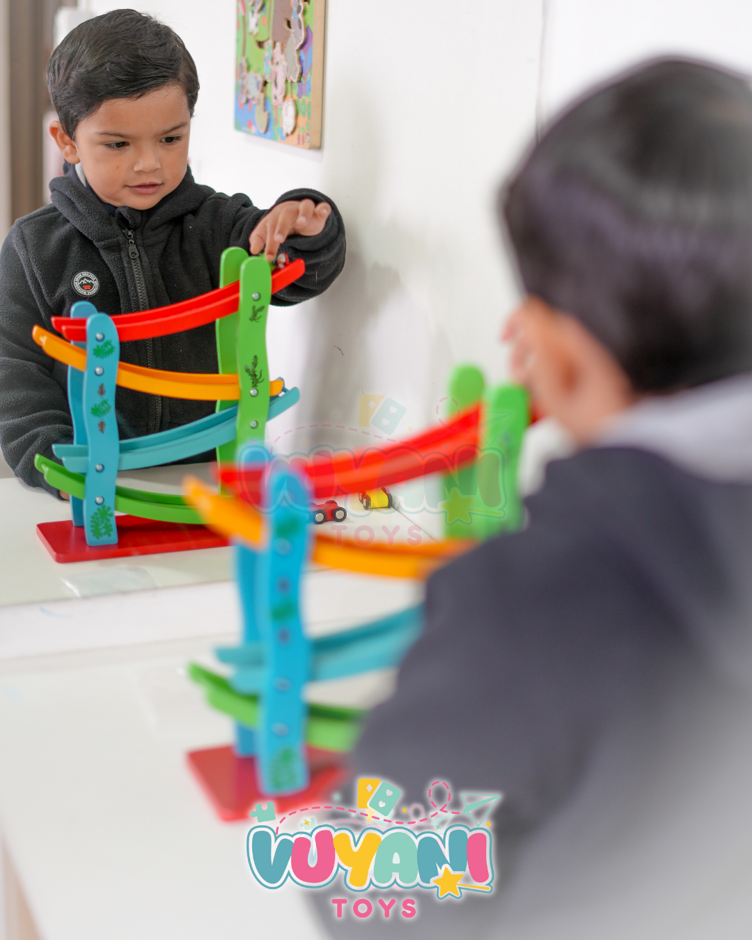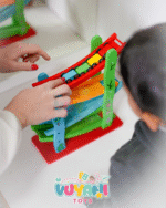 - Nombra los colores de los autos y cuenta en voz alta mientras descienden, estimulando el aprendizaje lúdico y la coordinación visual.