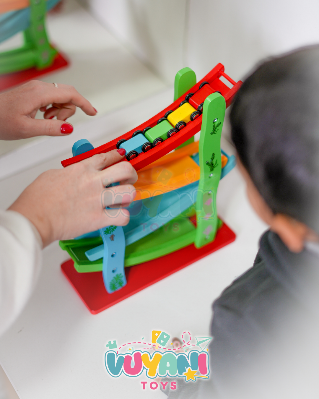 Este set de madera, seguro y resistente, es perfecto para que padres e hijos armen juntos la pista y disfruten horas de juego educativo y lleno de aventuras.
